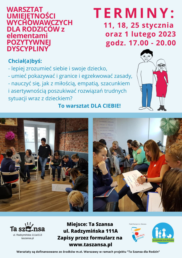 2. Cykl warsztatów dla Rodziców z elementami Pozytywnej Dyscypliny - warsztaty realizowane w ramach projektu "Ta Szansa dla Rodzin" współfinansowanego ze środków m. st. Warszawy - szczegóły https://www.taszansa.pl/wuw_2023styczen/