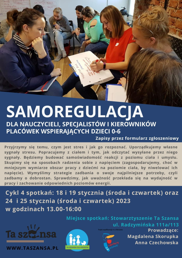 1. SAMOREGULACJA dla opiekunów i nauczycieli pracujących z dziećmi do szóstego roku życia - warsztaty realizowane w ramach projektu "Ta Szansa dla Rodzin" współfinansowanego ze środków m. st. Warszawy. Szczegóły: https://www.taszansa.pl/samoregulacja-dla-profesjonalistow/