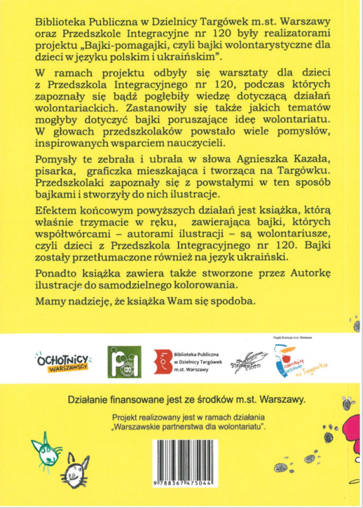 Projekt rozpoczęty udziałem w warsztatach wolontariatu. Bajki zostały przetłumaczone na język ukraiński. Zachęcamy rodziców i dzieci do odwiedzania Biblioteki Publicznej w Dzielnicy Targówek m.st. Warszawy.