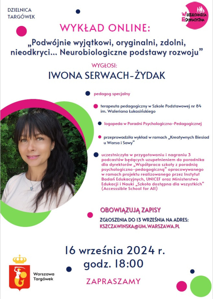 Wszechnica Edukacyjna Targówek „Podwójnie wyjątkowi, oryginalni, zdolni, nieodkryci… Neurobiologiczne podstawy rozwoju” - 16 września 2024 r. o godz. 18:00.
